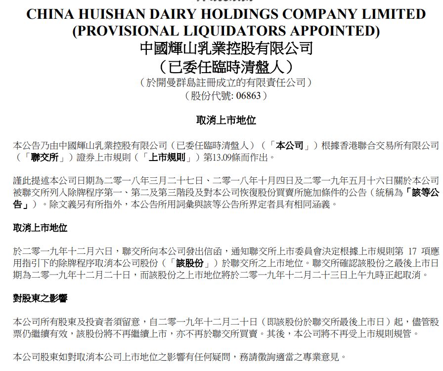两年前,一家东北上市公司,叫做辉山乳业,老板曾是辽宁首富,有一天被做空机构盯上,当天暴跌了85%,随后,停牌至今,直到12月18日晚间,被港交所取消上市地位,俗称强制退市。