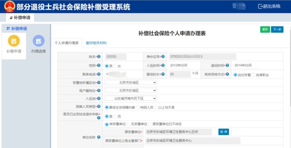 符合条件的退役士兵通过退役军人事务部政务服务平台登录部分退役士兵社会保险补缴网上受理系统后,选择“补缴申请”,按照要求填报补缴社会保险个人办理申请表要求的个人信息并上传相关证明材料。